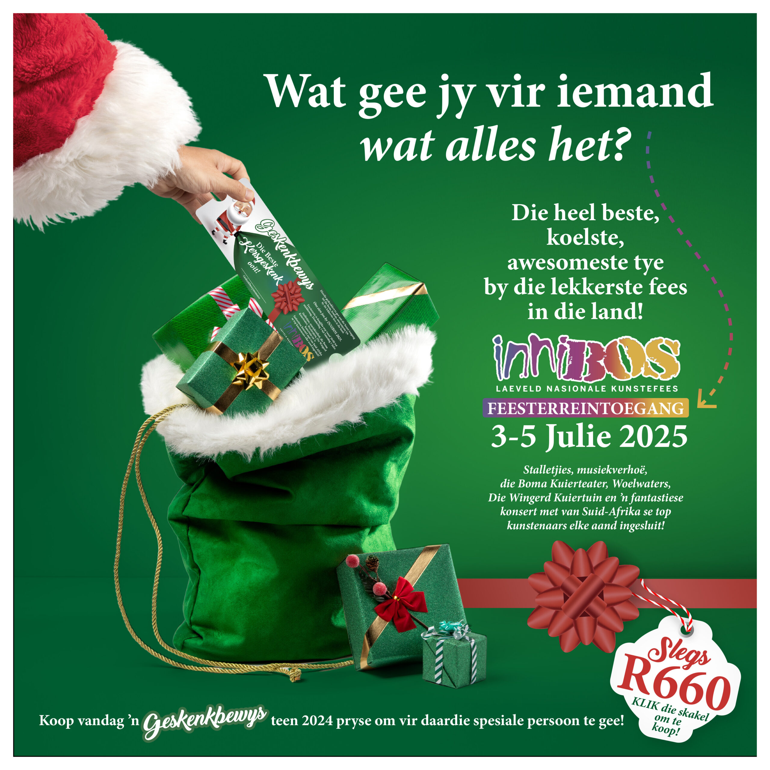 Innibos het die antwoord vir ‘n perfekte WOW-faktor kersgeskenk-idee. Volgens Sandra Jacobs, bemarkingsbestuurder van die Innibos Nasionale Kunstefees, is daar geen beter geskenk as ‘n WEEK-kaartjie vir 2025 se fees teen 2024 se prys van slegs R660 nie.