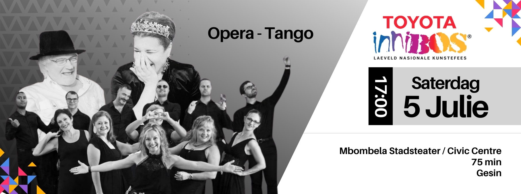 Die produksie word ingelei deur die klokhelder stemme van die Nocoré Ensemble, waarna die uitvoering voortgesit word deur twee van Suid-Afrika se mees gevierde kunstenaars, Zanne Stapelberg en Albie van Schalkwyk. Opera-Tango is ’n elegante vermenging van klank en emosie. Met Zanne se ryk, besonderse stem en die uitmuntende begeleiding van Albie op die klavier, word die gehoor meegesleur deur die mees ikoniese opera-arias en vurige Spaanse Zarzuela-arias. Zanne is bekend vir haar sielvolle en passievolle vertolkings. In arias soos Lascia ch’io Pianga en Come Scoglio word die emosionele intensiteit van elke noot en elke woord oorgedra. Albie se klavierspel is terselfdertyd delikaat en kragtig – ’n getuienis van sy merkwaardige kunstenaarskap. Die konsert bereik ’n hoogtepunt met die die Milonga uit Astor Piazzolla se tango-opera Maria de Buenos Aires. Opera-Tango is ’n magiese musikale reis gevul met die diepe skoonheid van klassieke musiek.